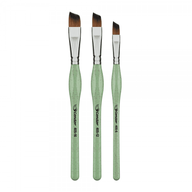 Kit com 3 pincéis artísticos referência 405 de formato chanfrado nos tamanhos 6, 12 e 16. Estes pincéis são de filamento sintético de alta qualidade e durabilidade. Esse filamento possui uma característica de proporcionar ao mesmo tempo flexibilidade e firmeza.