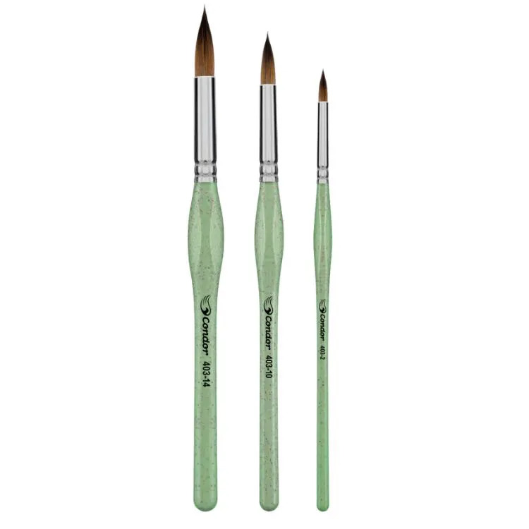 Kit com 3 pincéis artísticos referência 403 de formato redondo nos tamanhos 2, 10 e 14. Estes pincéis são de filamento sintético de alta qualidade e durabilidade. Esse filamento possui uma característica de proporcionar ao mesmo tempo flexibilidade e firmeza.
