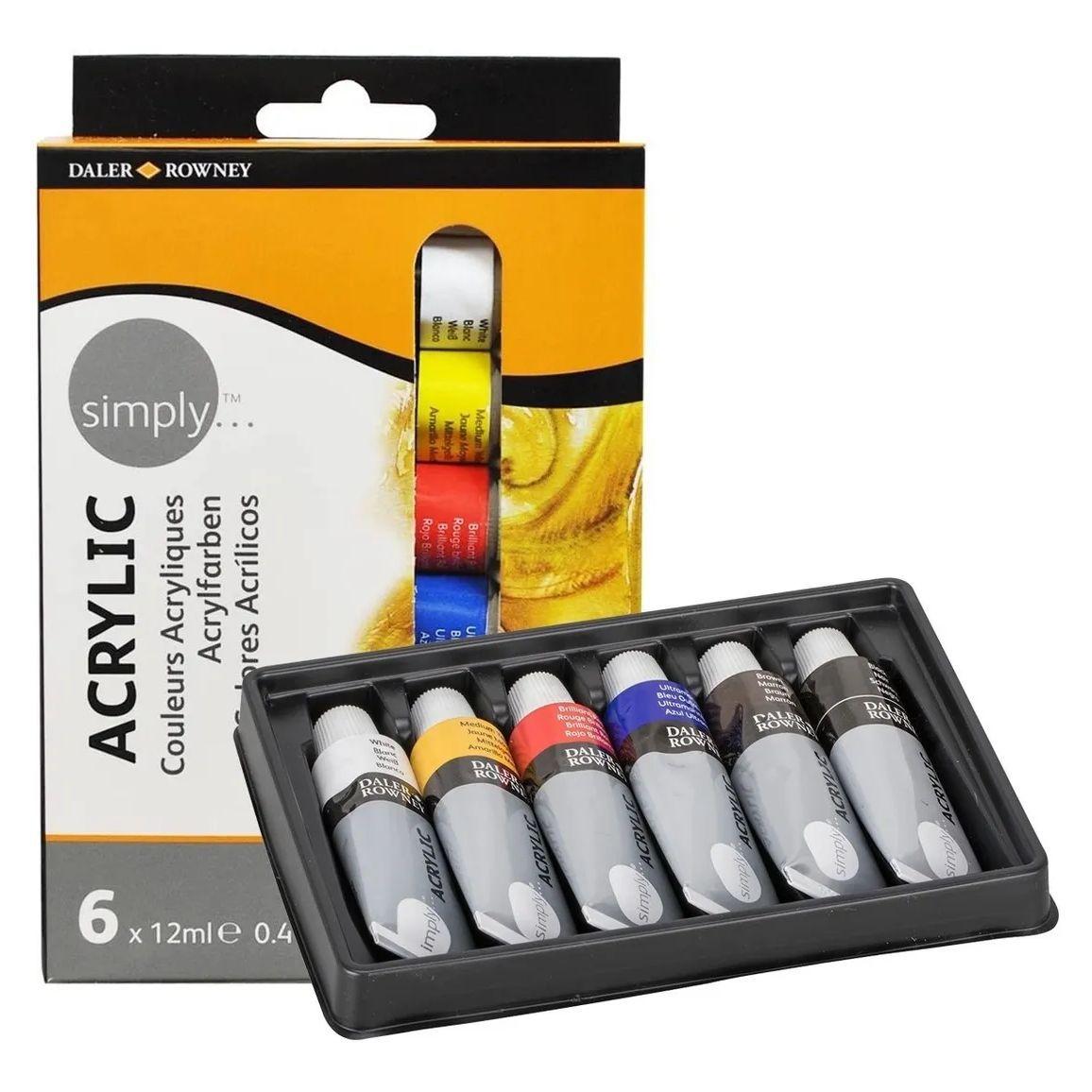 Estojo em papelão com 6 cores de tinta acrílica em tubo de 12ml cada.